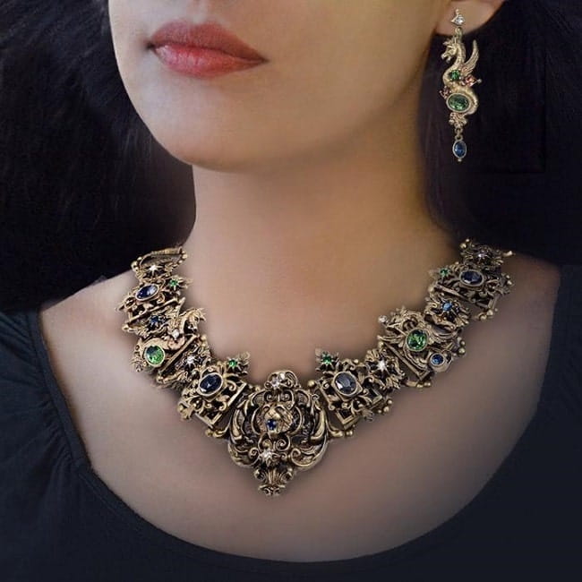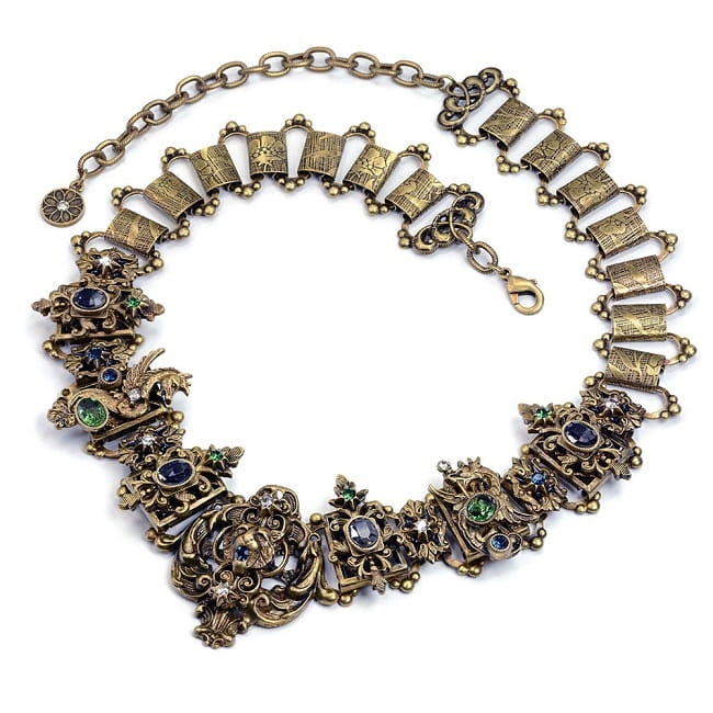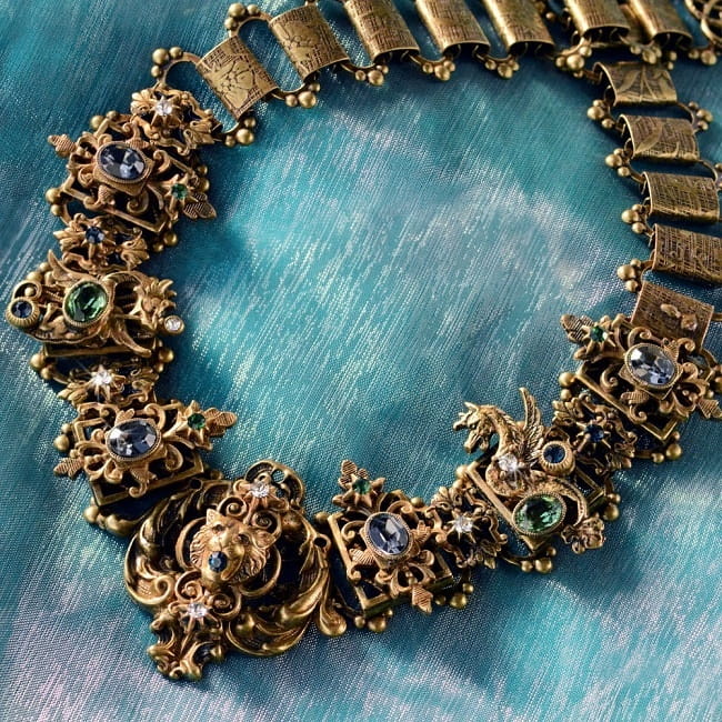 Bardzo oryginalny naszyjnik z motywami renesansowego, a nawet gotyckiego wzornictwa; głowa lwa symbolizująca siłę władcy; gryf symbol szybkości, siły,czujności, waleczności, odwagi i wytrwałości. Bogato wyglądający naszyjnik w formie kolii wygląda, jak wyjęty z muzealnej gablotki; królewski wygląd naszyjnika powoduje, że każda kobieta nosząca to cudo czuje się wyjątkowo; metal wykończony jest polerowanym brązem i ozdobiony kryształami w kolorze zielonym i szafirowym.