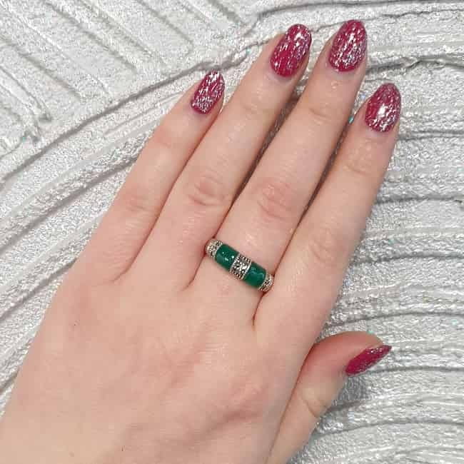 Ma prosty, a zarazem bardzo ciekawy wzór. Prostota to kształt pierścionka w formie szerokiej obrączki, natomiast oryginalność to wprawione w obrączkę dwa zielone agaty oddzielone między sobą błyszczącymi markazytami. Markazyty są też na zewnętrznych częściach agatów. Dwa zielone agaty są idealnie dopasowane do kształtu obrączki. Pierścionek wykonany jest ze srebra próby 925.