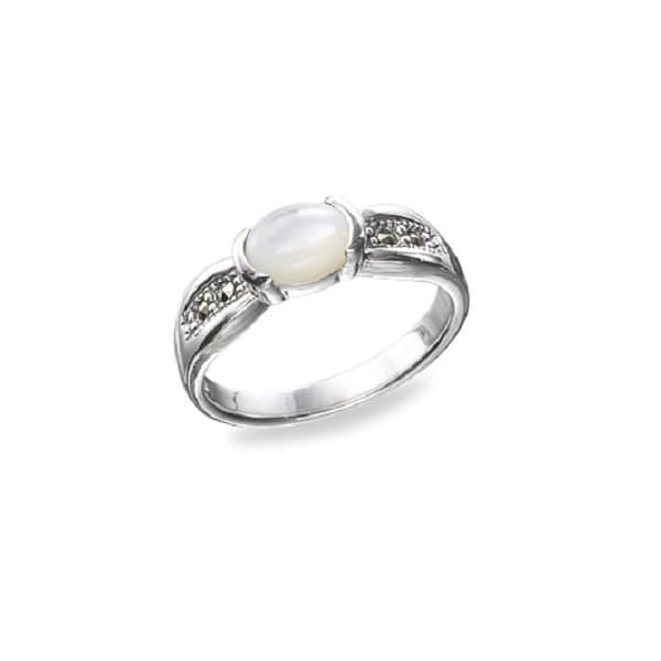 Ciekawy pierścionek z masą perłową w kolorze białym. Pierścionek ma kształt obrączki z owalnym oczkiem z masy perłowej, ciekawie osadzonym pośrodku pierścionka. Po obu stronach oczka osadzone są markazyty. Pierścionek wykonany jest ze srebra próby 925.