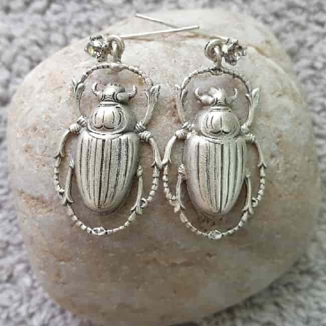 Skarabeusz z wyrzeźbionymi szczegółami, zawieszony jest na biglach, ozdobionym od przodu kryształkiem. Kolczyki wykonane są ze stopu metali lekkich w kolorze antycznego srebra.