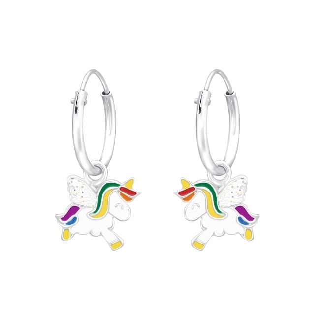 Kolorowy jednorożec zawieszony jest na kółeczkach z zawiasowym zapięciem. Kolczyki wykonane są ze srebra próby 925. Zapięcia nie powodują alergii.