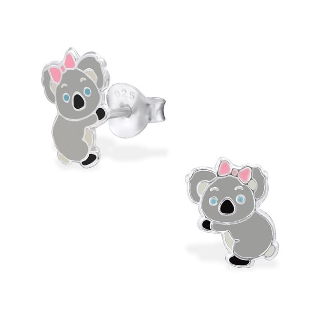 Kolczyki z podobizną misia koala dziewczynki z kokardką; misio jest ozdobiony żywicą w kolorze popielatym i różowym; kolczyki dla dzieci z misiem koala wykonane są w całości ze srebra próby 925;
