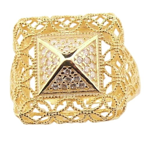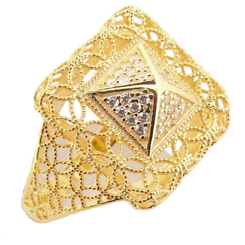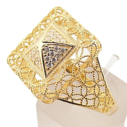 Centralną część tego pozłacanego pierścienia zajmuje piramida składająca się z 4 trójkątów, wysadzanych cyrkoniami. Piramidę otacza kwadratowa obręcz, przedstawiająca misterny, filigranowy wzór botaniczny. Cała przednia część jest trójwymiarowa. Ten sam botaniczny wzór, tym razem wykonany na płasko, znajdujemy po bokach pierścionka.