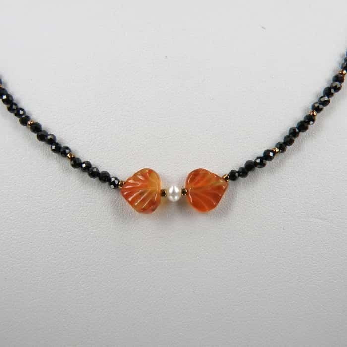 Naszyjnik spinele i karneol ma bardzo delikatny i kobiecy wzór. Cztery listki wyrzeźbione w karneolu, ozdabiają naszyjnik na końcach i pośrodku. Pozostałe elementy naszyjnika to drobniutkie, mieniące się czarne spinele, mała perełka słodkowodna i srebro próby 925.