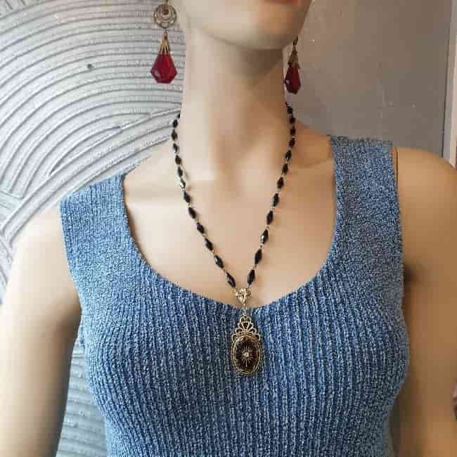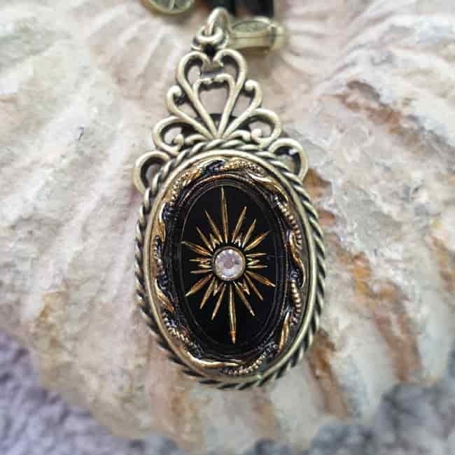 To wyjątkowo elegancki naszyjnik. Piękny owal z czarnego, matowego szkła, otoczony jest ozdobnym ornamentem z polerowanego brązu w kolorze starego złota. Pośrodku owalu umieszczony jest biały kryształek, otoczony grawerowaną gwiazdą w kolorze złota, co pięknie koresponduje z oprawą. Wisior zawieszony jest na łańcuszku, który tworzą szklane, czarne koraliki w kształcie wrzecion, połączonych między sobą ogniwkami w kolorze starego złota.