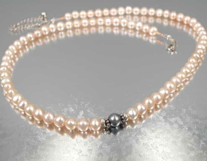 Naszyjnik z różowych pereł jest bardzo delikatny i subtelny. Wykonany jest z 74 sztuk różowych pereł hodowlanych. Pośrodku naszyjnika umieszczona jest między srebrnymi, ozdobnymi przekładkami, czarna perła, która przełamuje monotonnie naszyjnika i nadaje mu bardzo indywidualny wzór. Przy zapięciu pereł, znajduje się przedłużka ze srebrnego łańcuszka.
