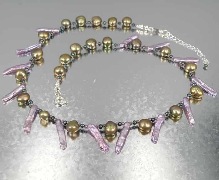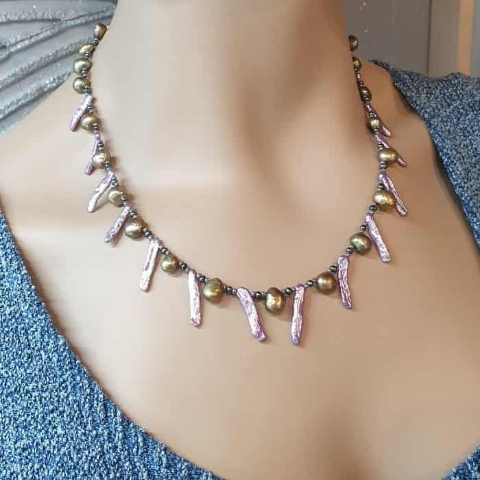 Oryginalny naszyjnik z pereł powstał z połączenia ich różnych kształtów i kolorów. Fascynujące połączenie zieleni ze złotymi refleksami i pięknego wrzosowego koloru podłużnych perłowych elementów tworzy bardzo ciekawą kompozycję unikatowego naszyjnika, który świetnie prezentuje się na dekolcie. Dodatkowo wkomponowane małe, ciemnozielone perełki między duże elementy naszyjnika, fajnie wzbogacają kolorystykę tego innego naszyjnika. Pozostałe elementy wykonane są ze srebra próby 925.