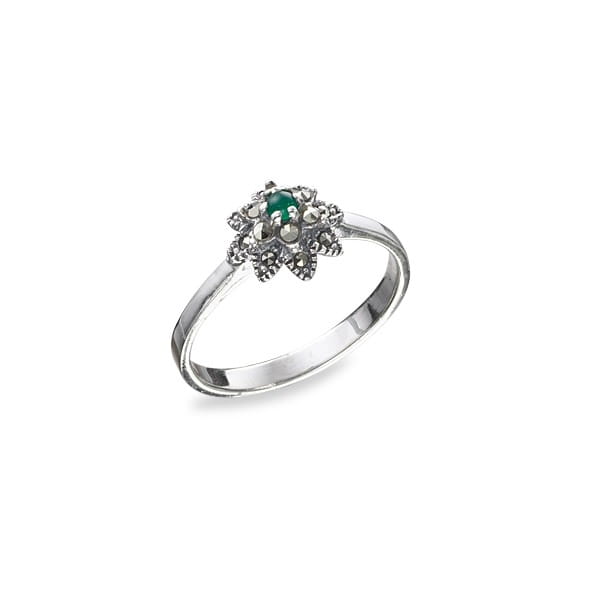 Pierścionek kwiatek z zielonym oczkiem z agatu ma delikatny i bardzo dziewczęcy wzór. Pierścionek wykonany jest ze srebra próby 925 i ozdobiony markazytami.