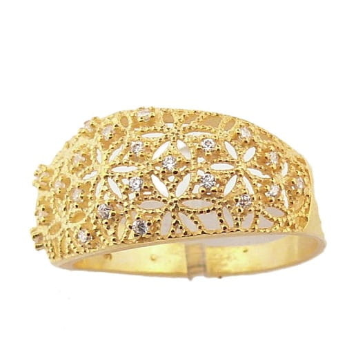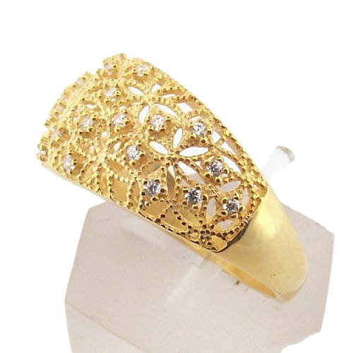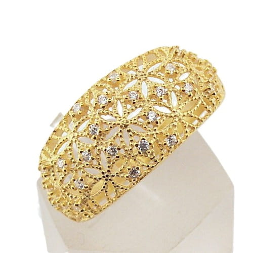 Uroczy pierścionek, wypełniony ażurowym motywem stokrotek, inkrustowany cyrkoniami. Część z filigranem lekko wypukła, dół gładki, błyszczący.