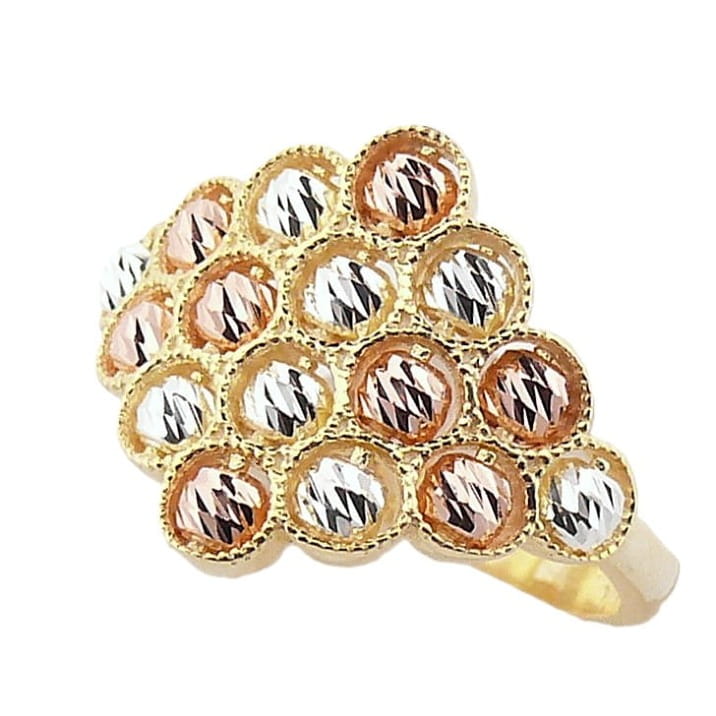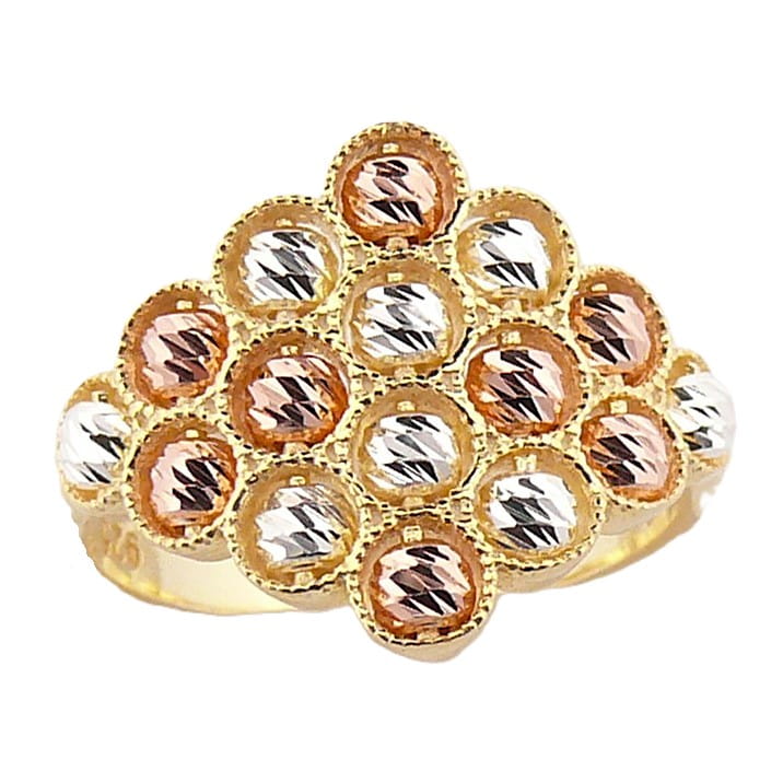 Pierścionek w kształcie rombu, wykonany metodą filigranu, pozłacany, na srebrze próby 925 (92,5% czystego srebra). Romb wypełniony kuleczkami z różowego złota i srebra - kolory rozmieszczone symetrycznie. Szlify na ruchomych kuleczkach sprawiają, że kuleczki odbijają światło i połyskują. Zarazem nietypowy i interesujący, ale delikatny.