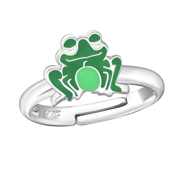 Pierścionek z żabką wykonany jest ze srebra próby 925; motyw żabki nadaje pierścionkowi wesoły charakter; żabka ozdobiona jest dwoma odcieniami zieleni; pierścionek ma regulowany rozmiar.