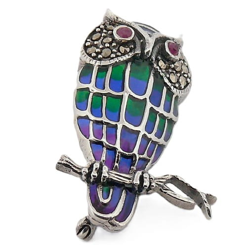 Śliczna, srebrna zawieszka art deco w kształcie sowy siedzącej na gałęzi. Srebro próby 925. Wzór wypełniony kolorową emalią jubilerską - prześwituje pod światło. Na ubraniu emalia wydaje się prawie czarna. Oczy z rubinów. Policzki wypełnione połyskującymi, naturalnymi markasytami - zwanymi potocznie szarymi diamentami.