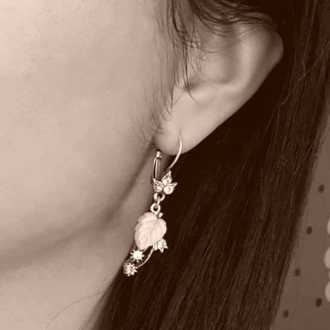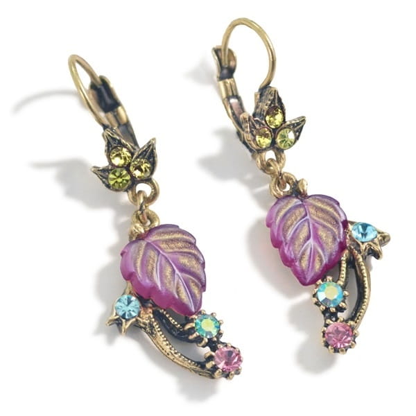 Wiszące kolczyki vintage z satynowego szkła w kolorze ametystowym, ozdobione są mieniącymi się kryształkami. Metal w kolorze starego złota, wykończony polerowanym brązem nie zawiera niklu i nie powoduje uczuleń. Matryce użyte do wykonania listków pochodzą z ok.1910 roku. Satynowe szkło pięknie opalizuje, tworząc niepowtarzalne efekty. Zapięcia to bezpieczne bigle, zapewniające komfort noszenia.