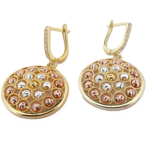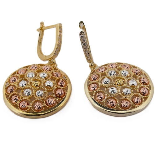 Wyjątkowe, pozłacane kolczyki wiszące w kształcie kół. Kolczyki są wypełnione ruchomymi kuleczkami z różowego i żółtego złota oraz srebra - umieszczonymi na filigranowym wzorze. Kuleczki mają poprzeczne szlify, co sprawia, że mienią się w słońcu.