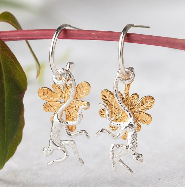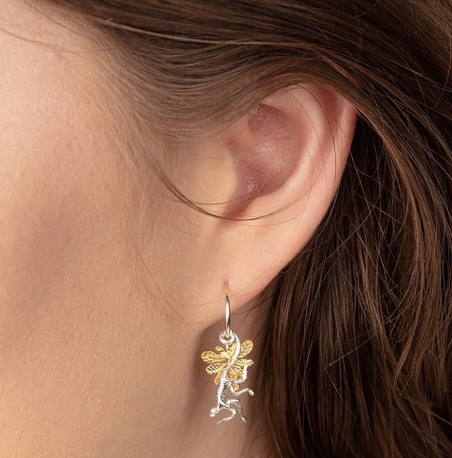 Te wyjątkowe kolczyki z małpami należą do najnowszej kolekcji Amandy, inspirowanej twórczością Henry Rousseau; wysmukłe sylwetki małp, wiszą zaczepione ogonem, na srebrnych, okrągłych biglach, na tle złotych liści aralii; kolczyki wykonane są ze srebra próby 925 z elementami pozłacanymi 22-karatowym złotem.