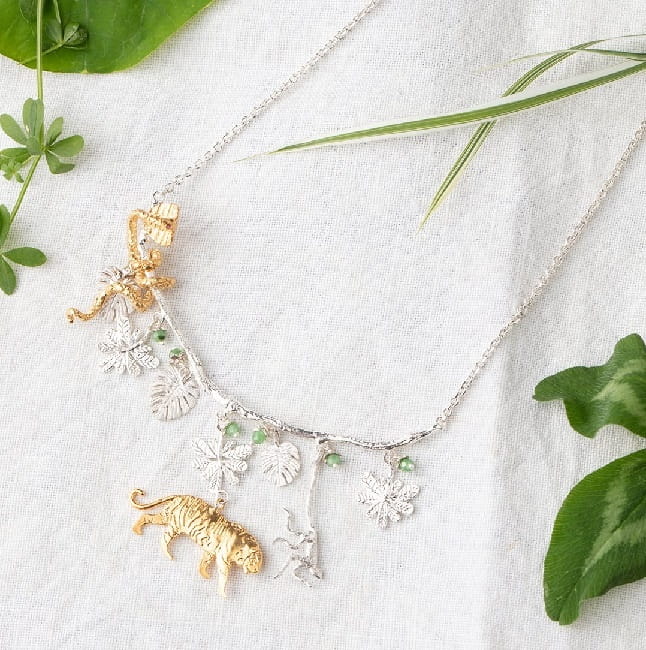 Naszyjnik składa się z wielu elementów: skradający się tygrys, skacząca małpa, czająca się kobra, umieszczone są pomiędzy liśćmi monstery, aralii i kuleczkami z zielonego zoisytu, tworząc atmosferę dżungli, jak z obrazów Henry Rousseau; naszyjnik wykonany jest ze srebra próby 925 z elementami 22-karatowego złota vermeil; na końcu przy zapięciu zamocowana jest oryginalna sygnaturka Amandy Coleman.