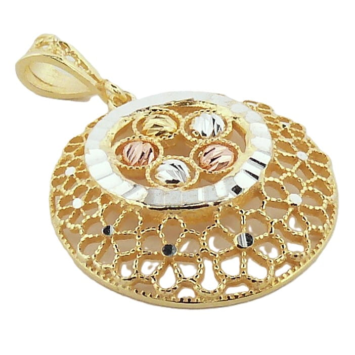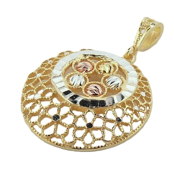 Pozłacana zawieszka w kształcie koła. Centralne, srebrne koło wypełnione 5 ruchomymi elementami z różowego złota i srebra - każdy wpisany w pozłacane kółeczko. Zewnętrzna część zawieszki misternie ozdobiona filigranowym wzorem w kształcie stokrotek, każda z mieniącą się, srebrną kropeczką.